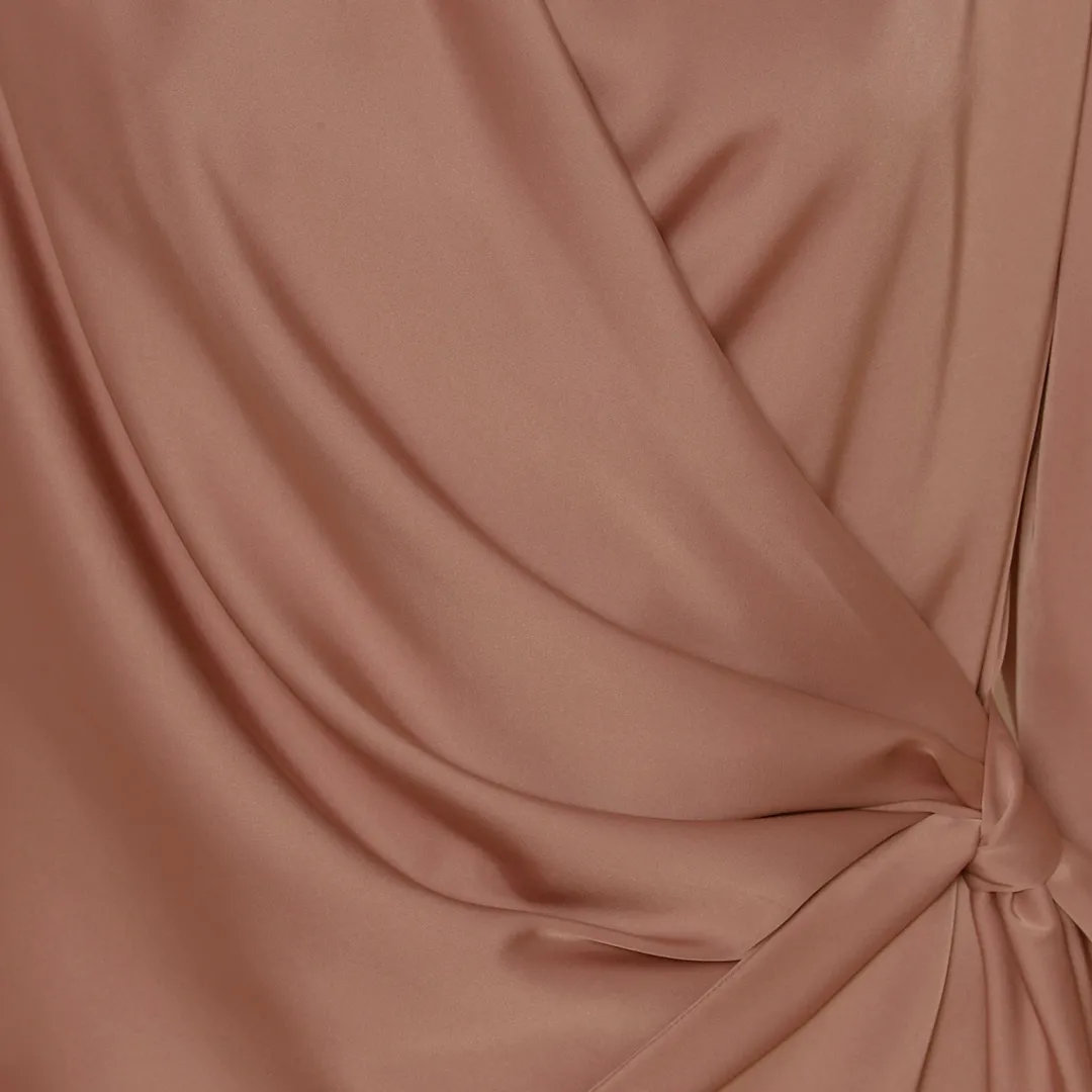 Blusens front er syet fast i højre side og bindes i en strop i venstre side. De lange ærmer afsluttes med manchet og 2 knapper.