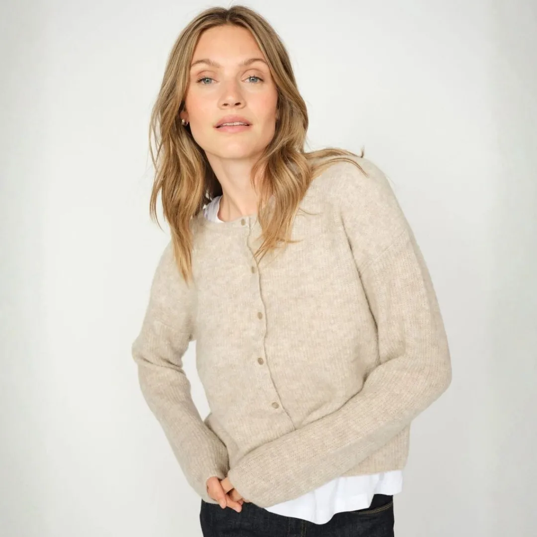 Cardiganen har rund hals og lille ribkant ved både ærmer og bund.