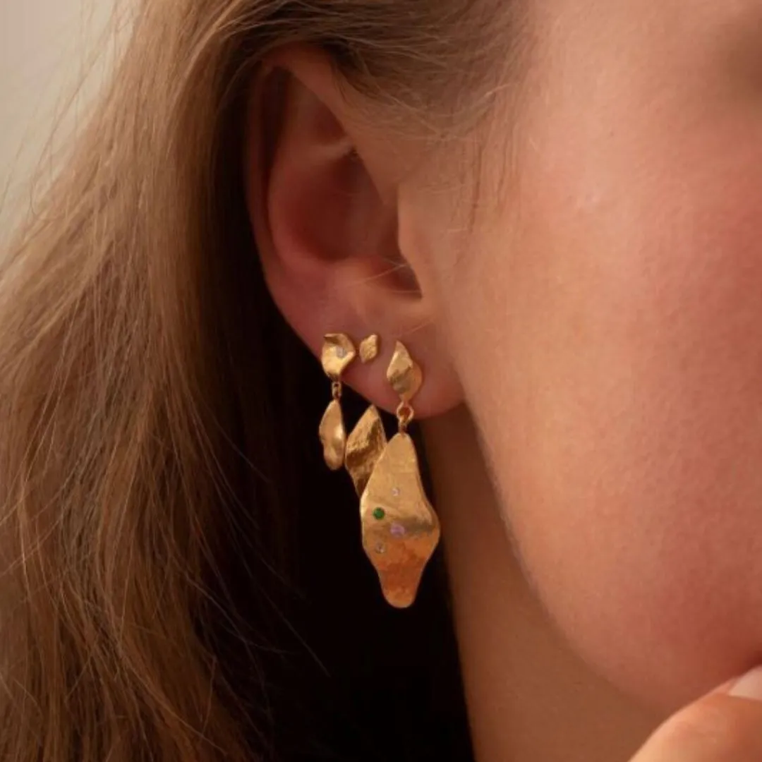 Smuk guldfarvet ørering fra Stine A. Ørestikken forestiller en plade der minder om et lille blad, med bølget overflade. Smuk både alene eller som sæt.