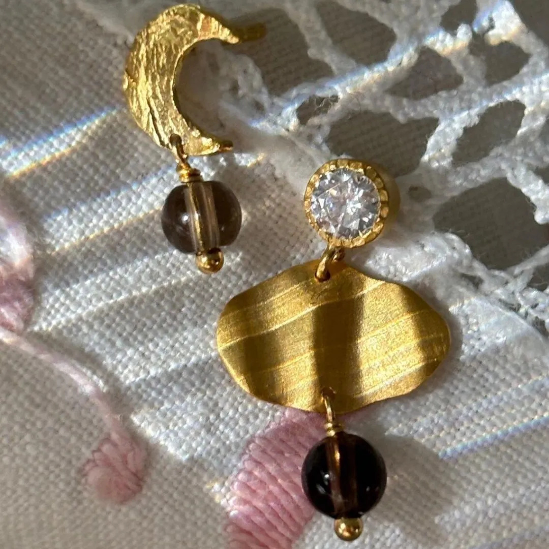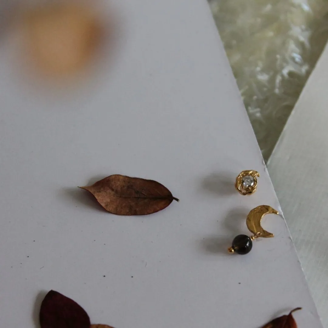 Fineste Petit Clare måne ørestik fra Stine A. Ørestikken er designet med en banket oveflade på månen, og derfra hænger der en smuk brun perle. Style den som den er, eller sammen med dine favorit smykker.
