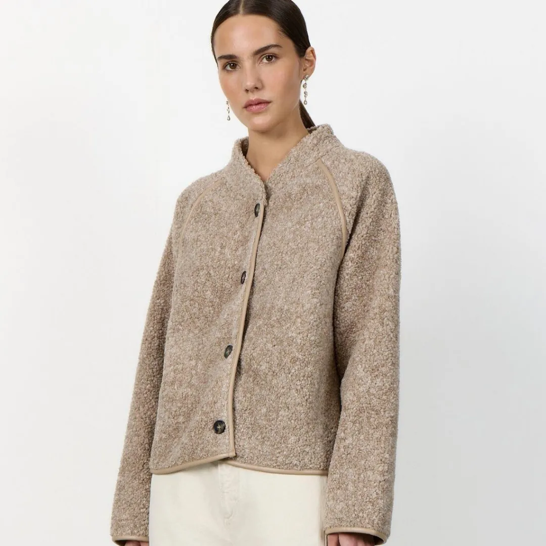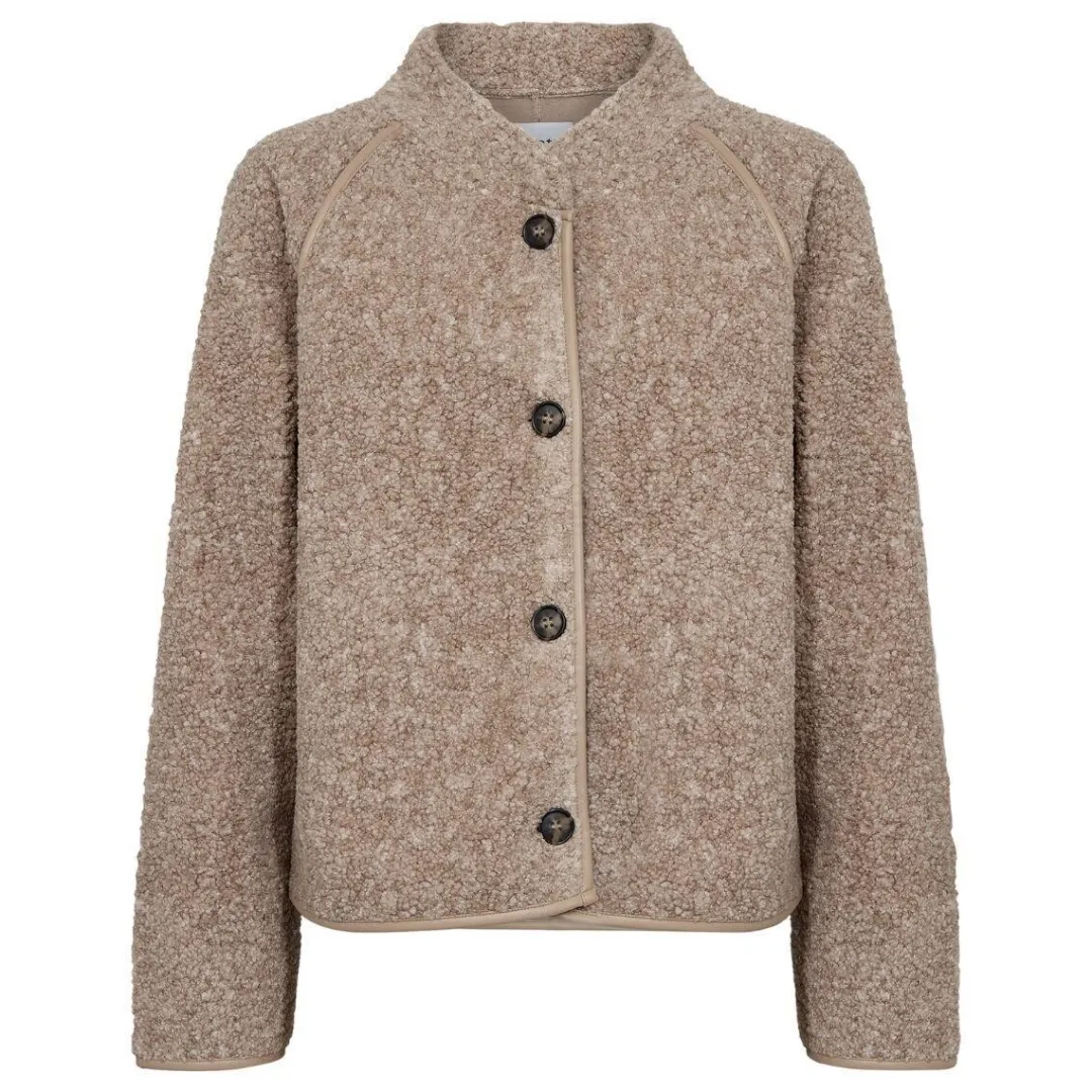 Super lækker teddy jakke i sand melange fra Leveté Room. PERNILLE 1 jakken er designet med et elegant look, og tone i tone kanter for detaljen. Den har høj krave og lukkes med dekorative knapper. Ærmerne er lange med mulighed for et ombuk. Perfekt til forårs sæsonen.