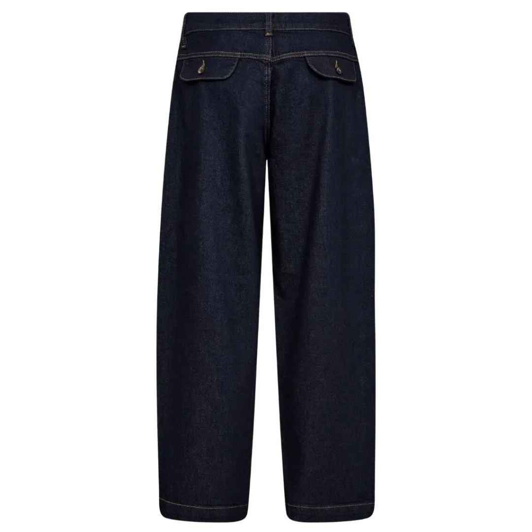 De super fine Tino Chino jeans i denim fra Mos Mosh. Jeansene er inspirerede af chino modellen og designet i en flot mørk blå denimkvalitet med orange kontrastsyninger. Den har fast linning med stropper til et bælte og lukkes med lynlås og en dekorativ knap. Derudover er der to baglommer med klap og knap og de vide ben går en smule ind forneden. Must have til sæsonens jeans samling.