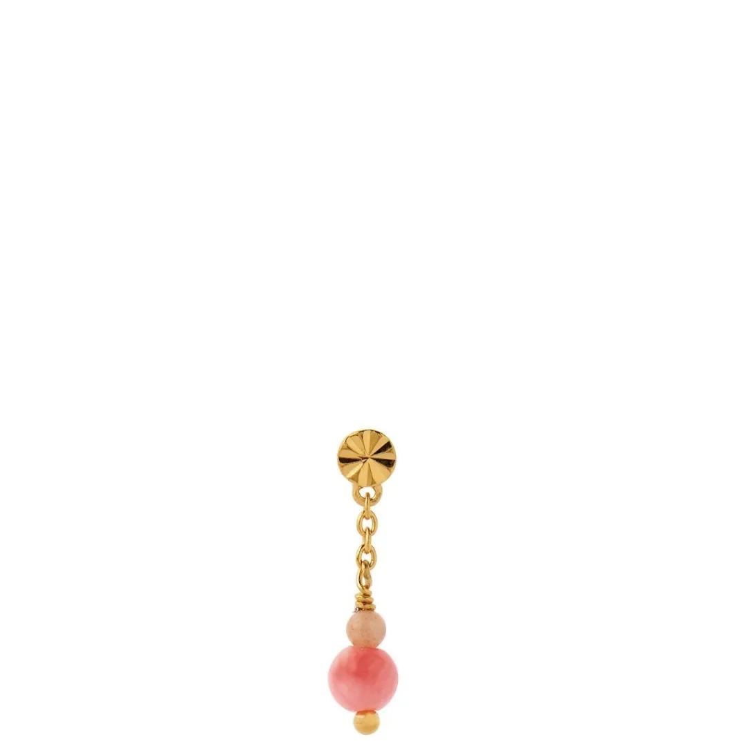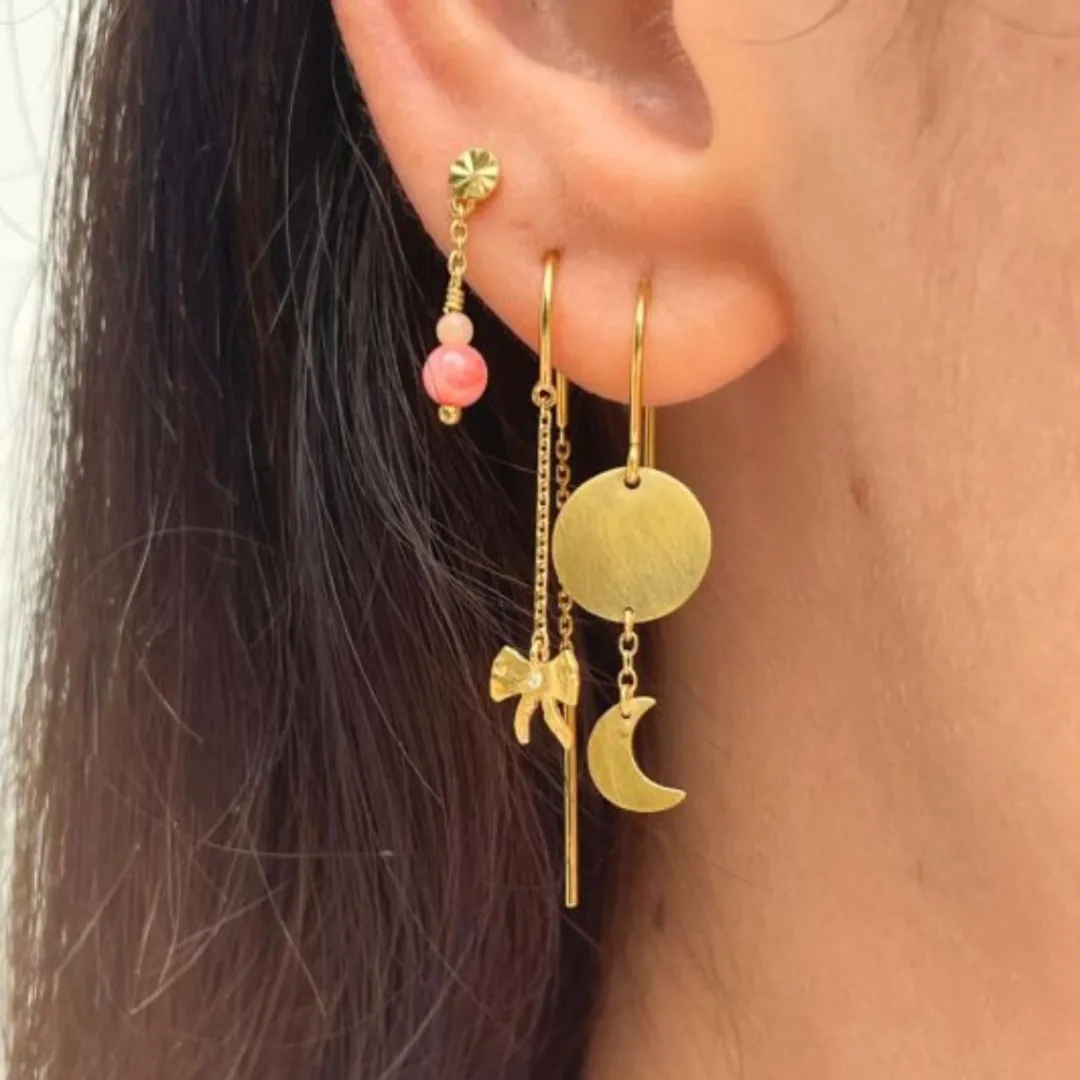 Smuk ørestikker fra Stine A. Ørestikkeren består en rund guldfarvet plade med riller i overfladen. Ned fra pladen hænger der en kæde, hvorpå der sidder to fine perler.